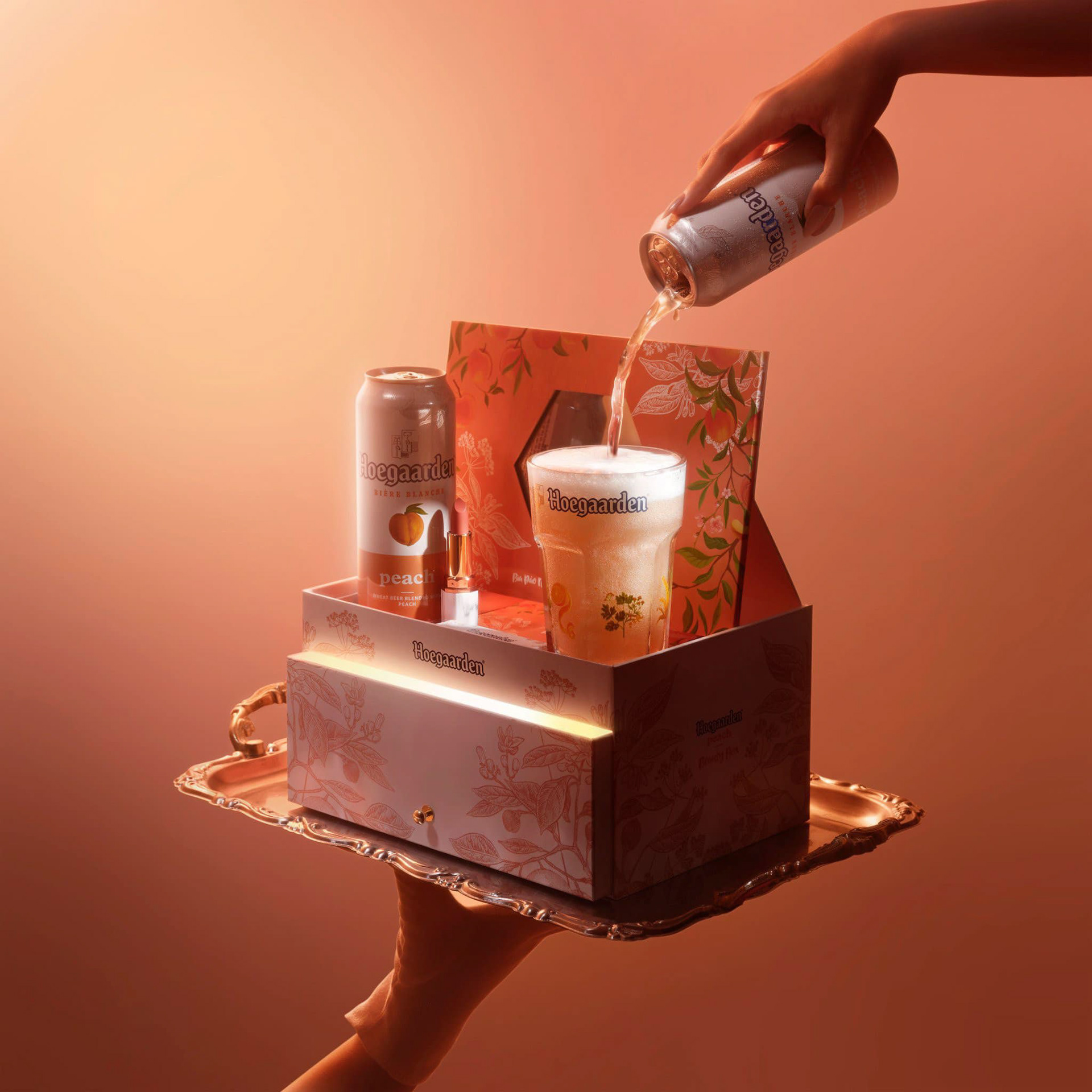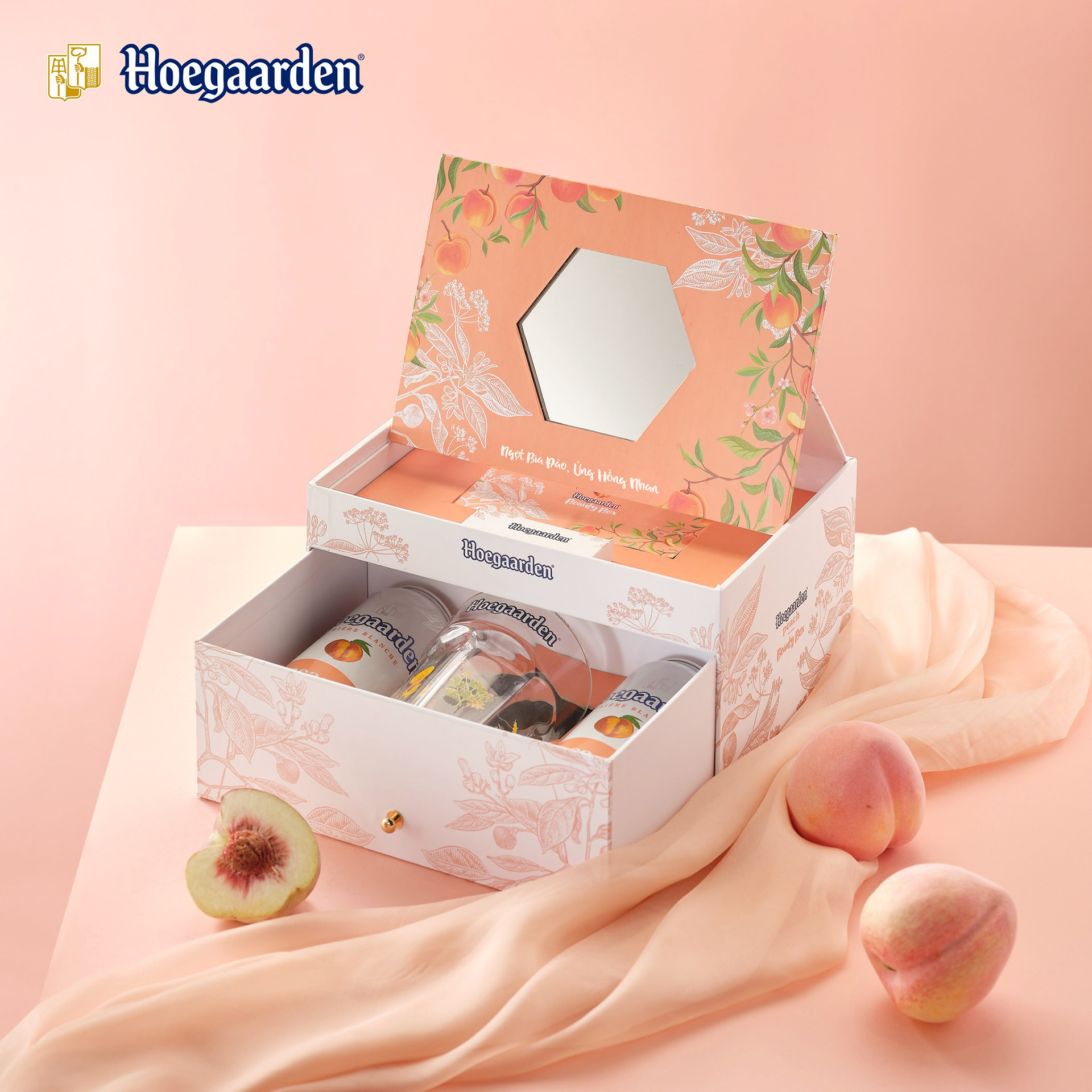 For the launch of Hoegaarden Peach in Vietnam, we created the perfect kit to make up, get a first sip of Hoe peach and get ready to open the second layer of the box including glasses and cans to enjoy a sweet moment.